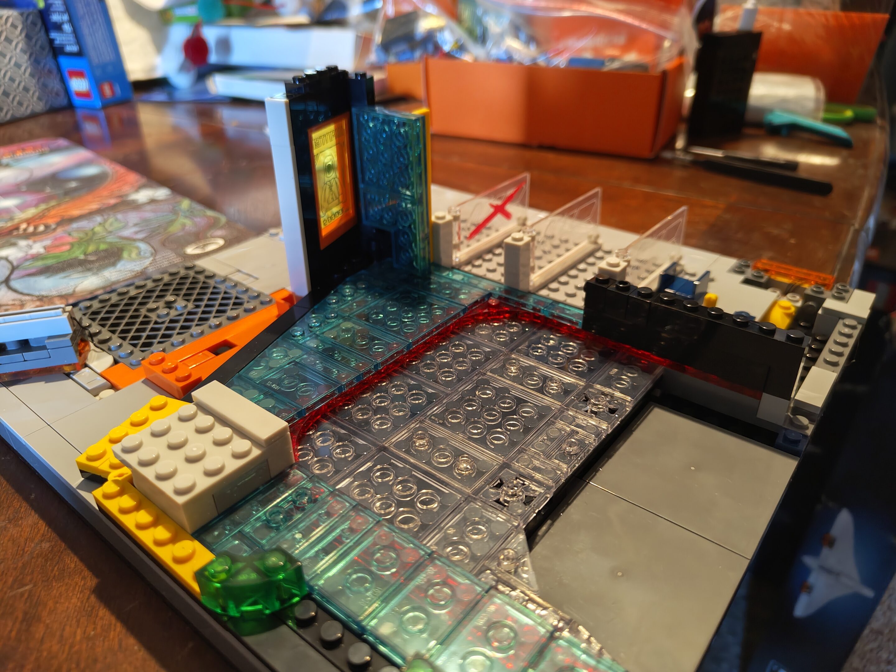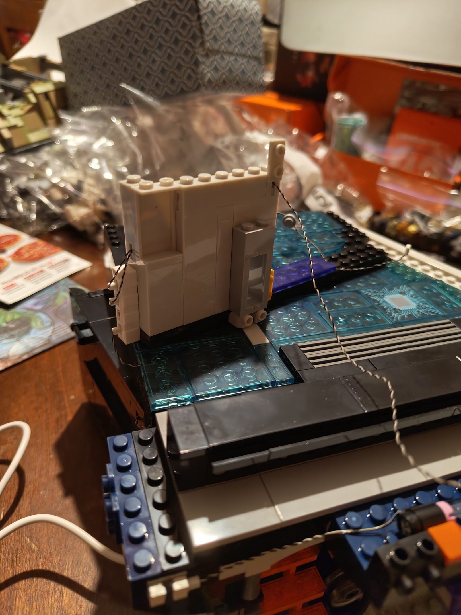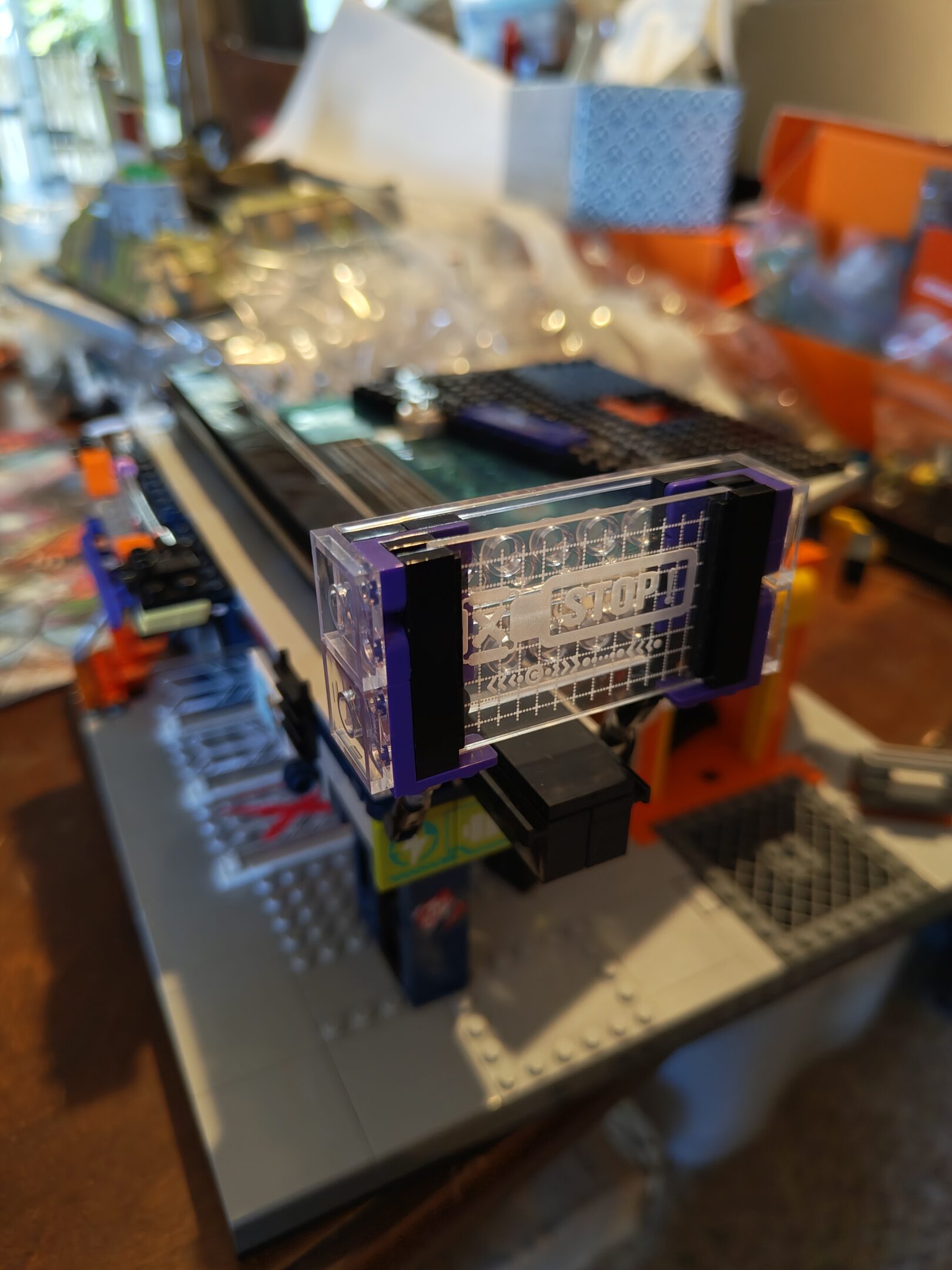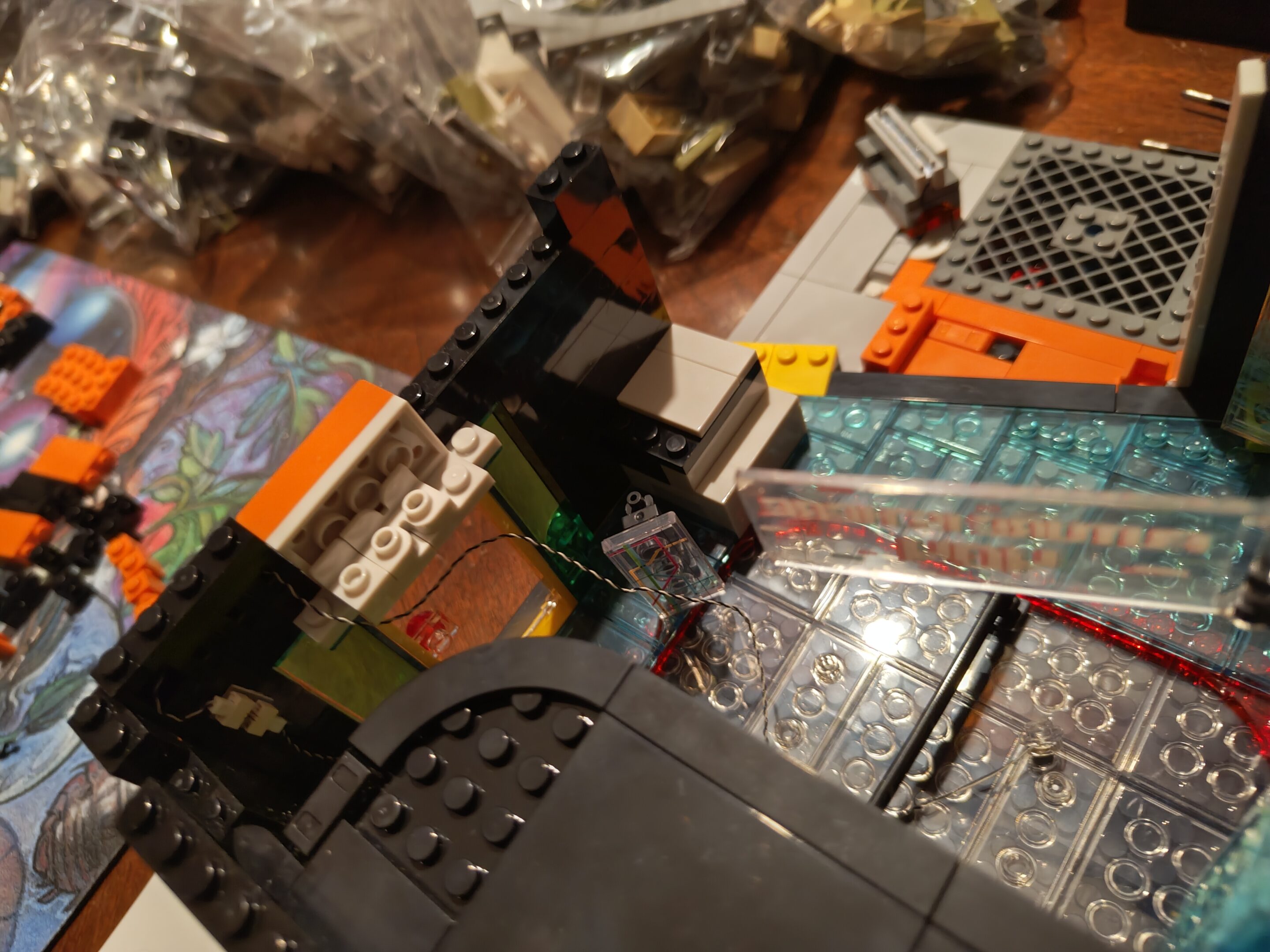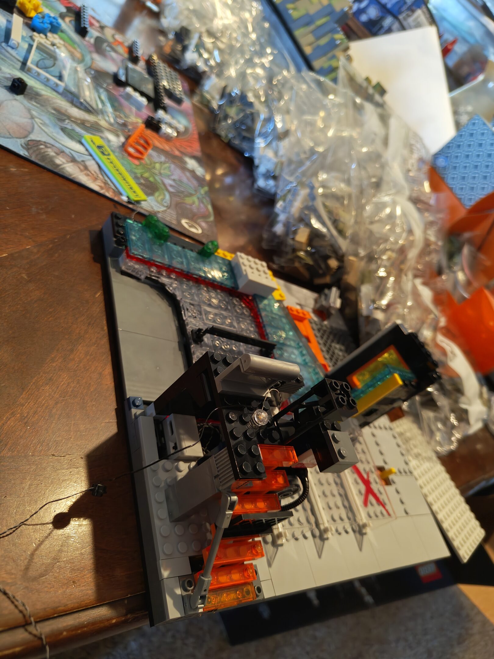 We start the day with a … man I dunno what even to call some of these yet. But it was on the left.Train goes here (eventually)See, here’s the train sign and everything“Ever since installing the flashing stop sign, we hardly have any trains fall off the tracks anymore!” (from the instructions)Maglev train track (and neon)See, neonPower hubWiring everywhereHere was the second set of errata but … yeah okay they are slightly different but honestly this one was only cosmetic (unlike the other)Wiring absolutely everywhere at this momentTesting connectionsWiring wildly out of controlMuch tidier wiring. Testing lights and connections — unfortunately where I stopped for the night the train sign and neon aren’t connected yet. But it looks so coooooooooool already