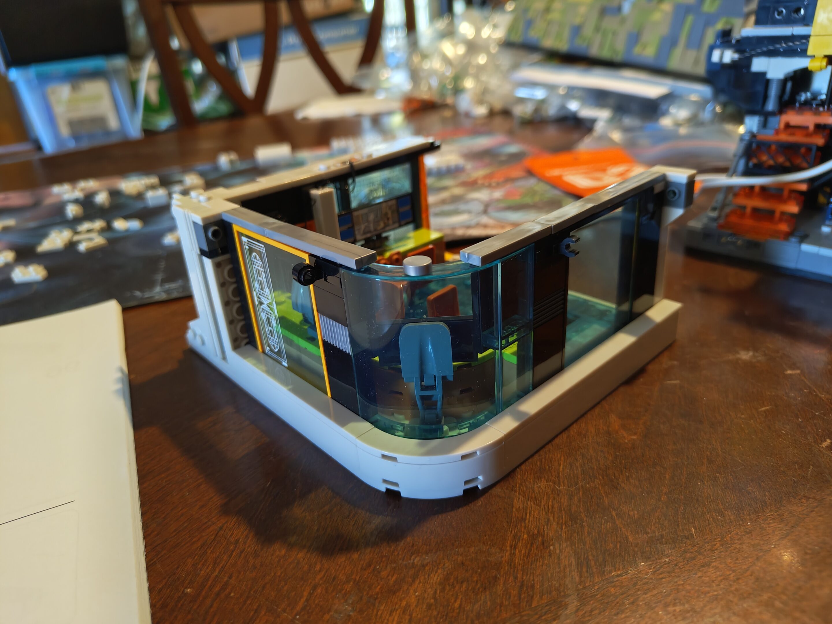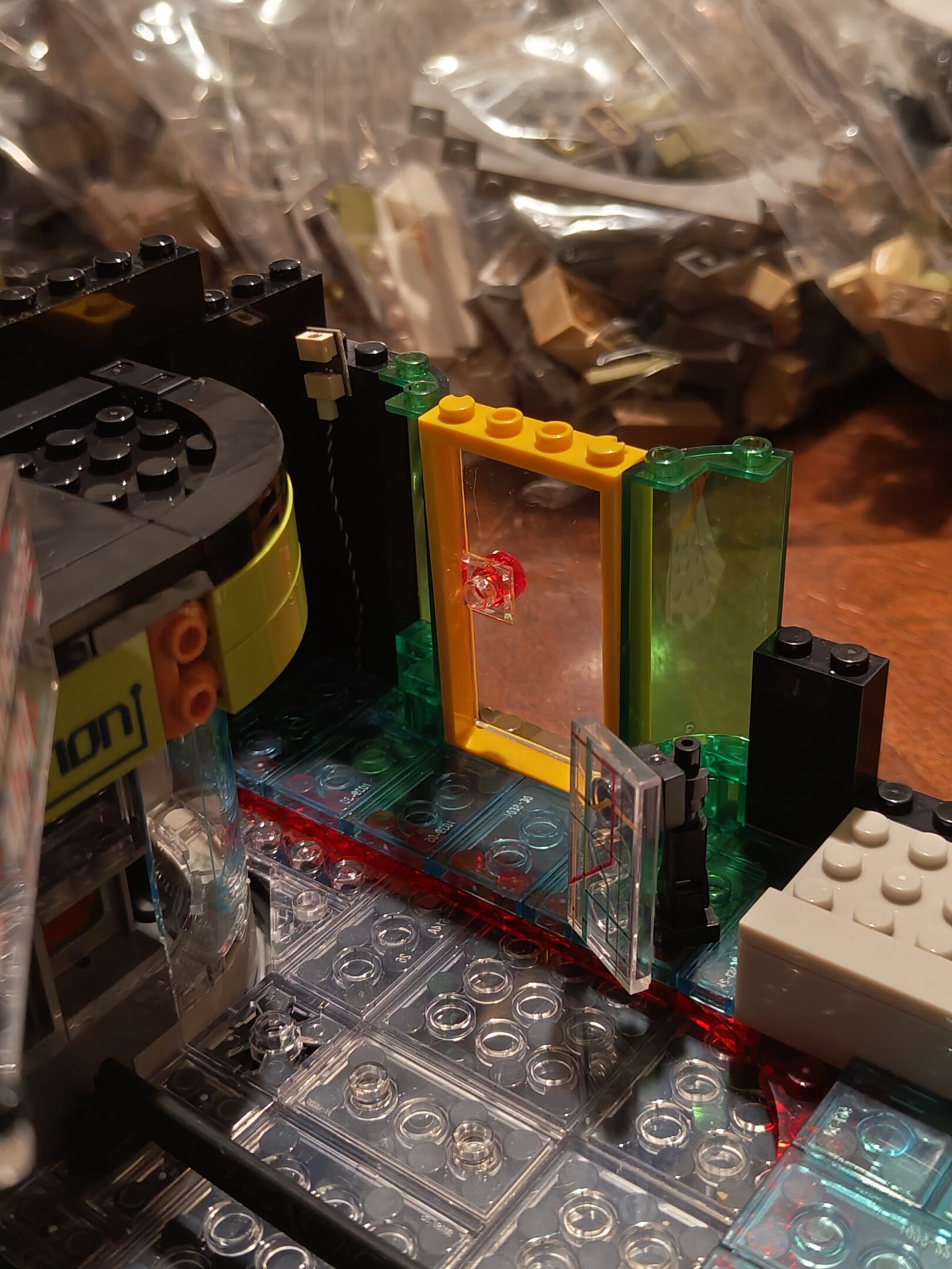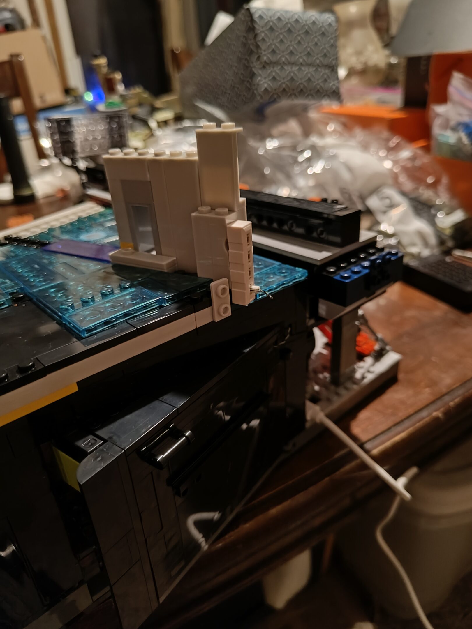 Not super interesting yet but I like these translucent tiles…of which there were a bunch of in this stepWiring for this step starts here (the pogo pin connector block)Grey blocks attached to wiring make the neon effectWasn’t sure what these were at first, but they’re desks. One has a mouse alreadyLots of windows on this floorDesks and monitors. Wiring for the next floor, too (pogo pin receptor on top)Finished walls + windows and ledgeAnother swinging rear door for play accessI had to rebuild this section during the “finished walls + windows and ledge” because I put the wrong piece underneath the fan section – a grey 1×6 plate – the manual was a little unclear in this step as it’s used the same indicator “not silver” for both white and grey?In place with the lights on, third floor of the train station is the control room