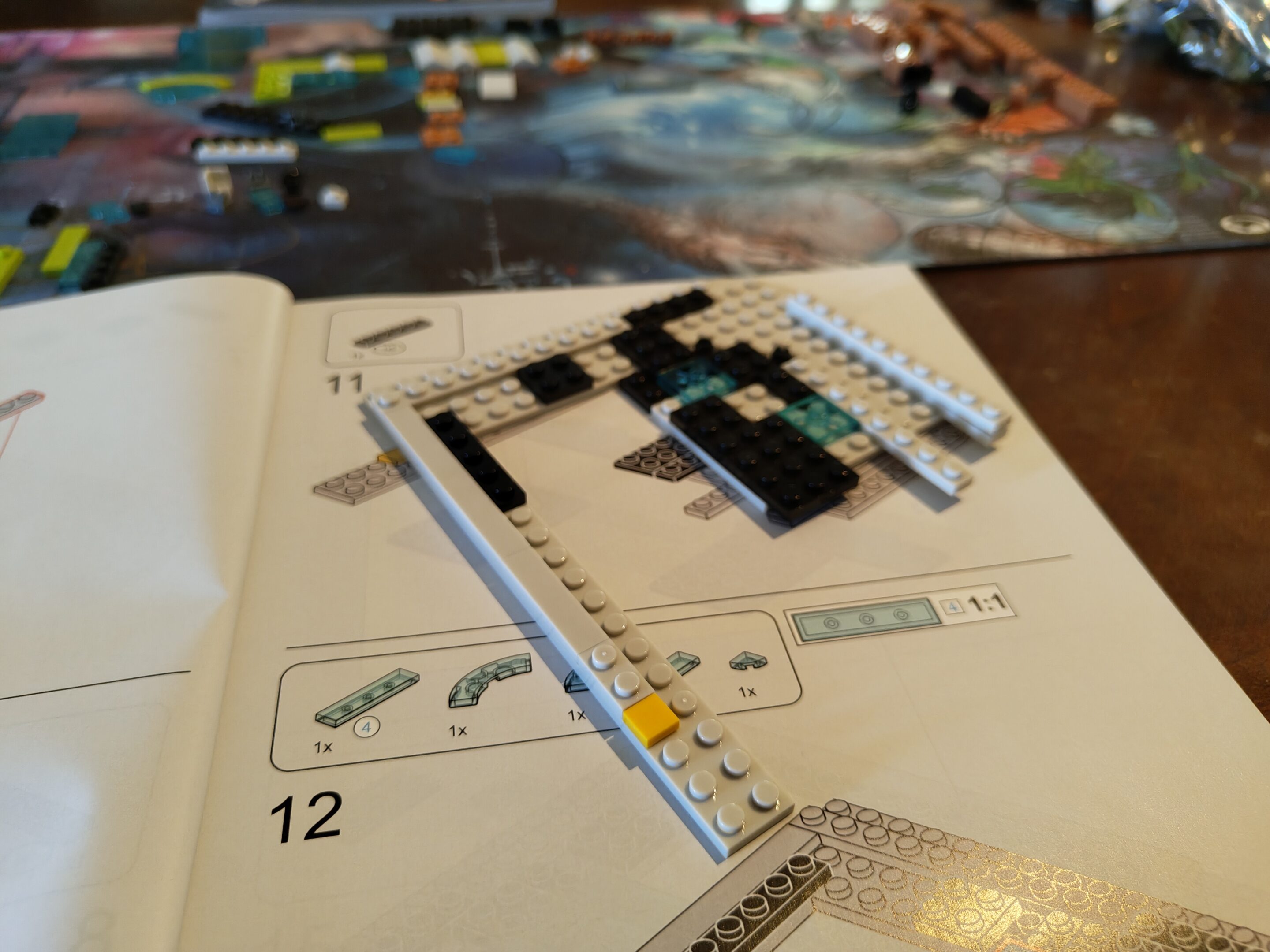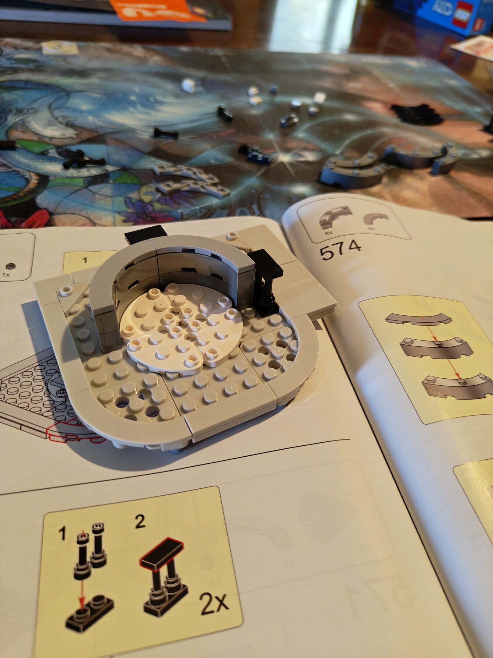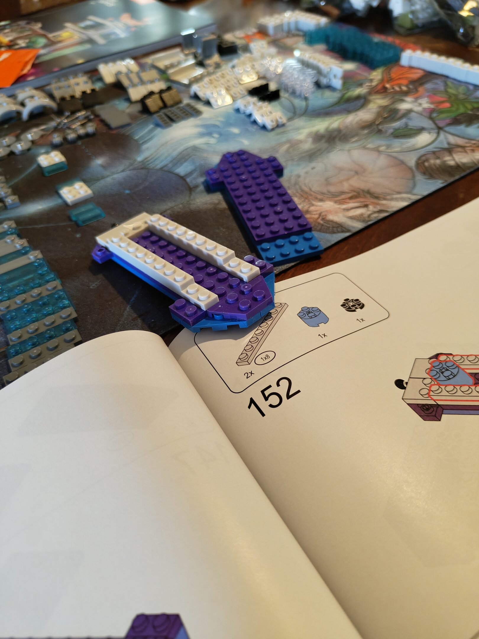 did a little bit yesterday after lego with mom but was running late so i kinda just left all my shit on the table, ugh. i did finish up the next day (today, friday september 26th) but wasn’t really feeling very well so it took me like two days to get one set of instructions done, not great. on the plus side though, finished up the first book and onto the second book — and i found another error that’s not in any of the errata so i got to remember to email them about it. also not a lot of pictures like other steps due to not feeling great and just trying to clear up the mess so mom and i can work on the castle tomorrow