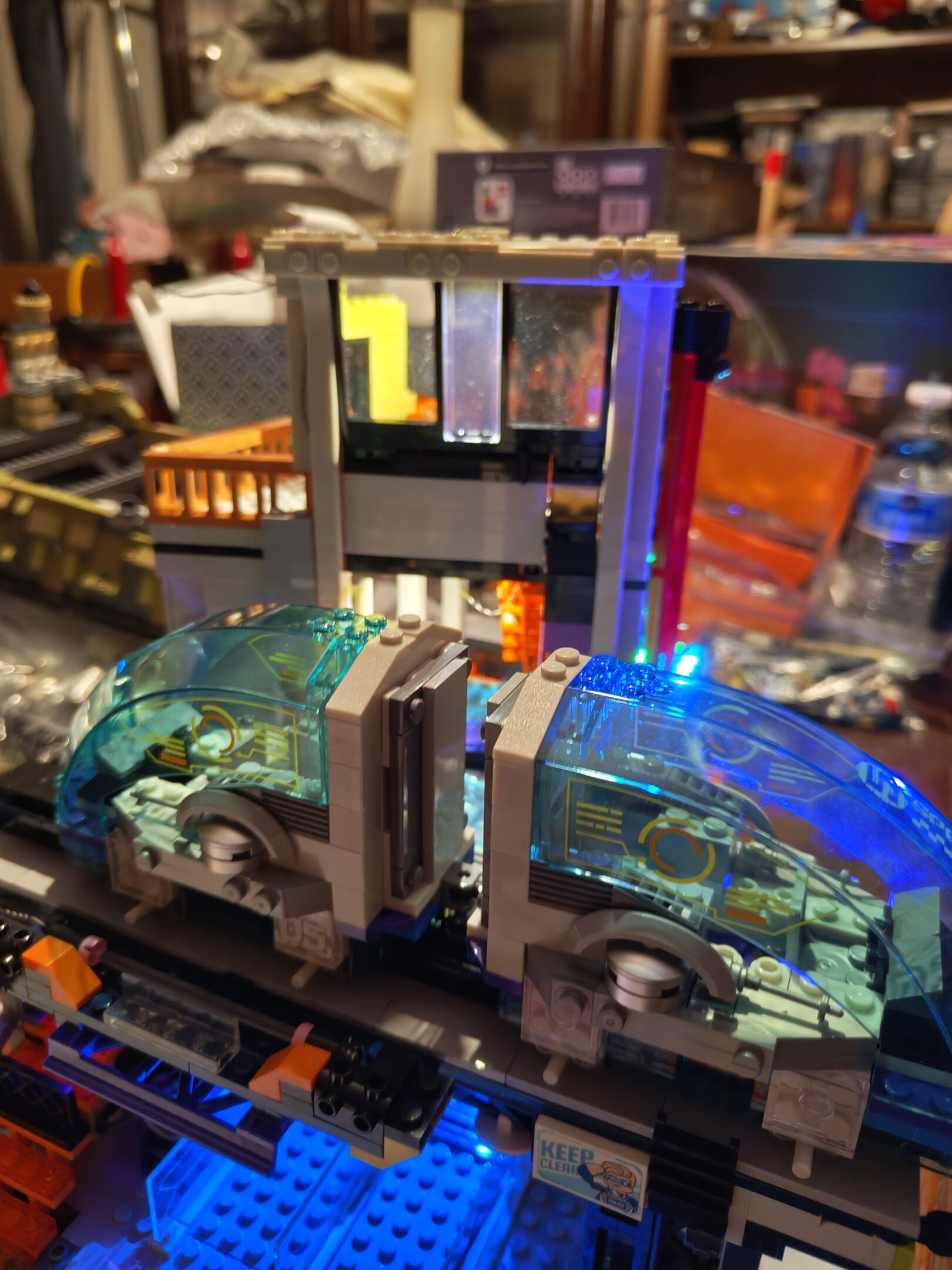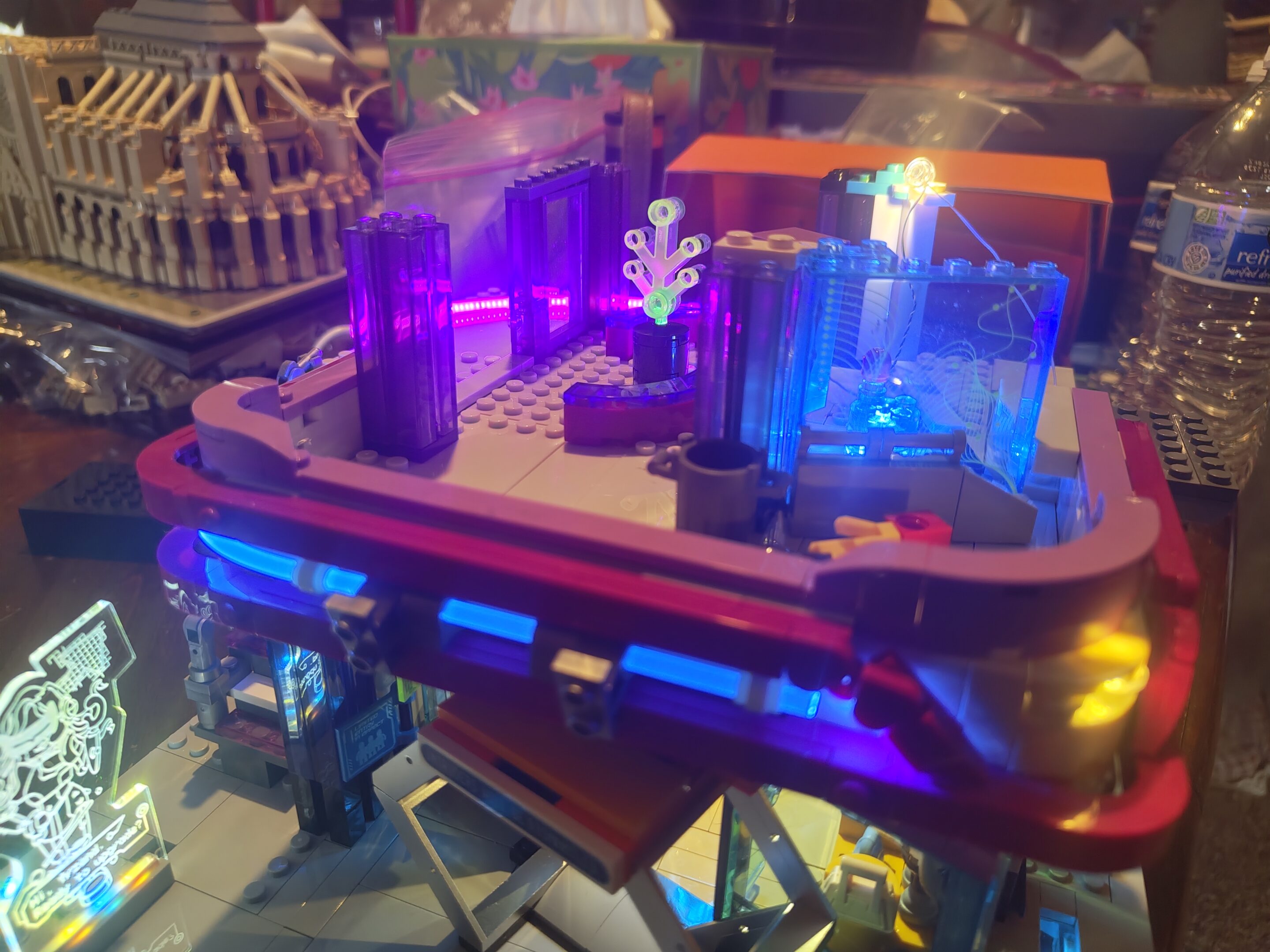 okay lets fix the filler text in with the actual text now that i’ve started. didn’t get much done today since it’s a friday and usually i’ve got a thing to do but instead woke up puking so, you know, great start to the day. but i got some brick time in maybe it’s a wash. anyway. the floating train station, 3rd set in the cyberpunk neoncity set from lumi. i have mine in a different layout from theirs here — i think i’ll have the izakaya on the far left then apartment then game stack then train station? we’ll see once i’ve got all four built but i do know it’s gonna look so fucking cool and anyone should be damn envious