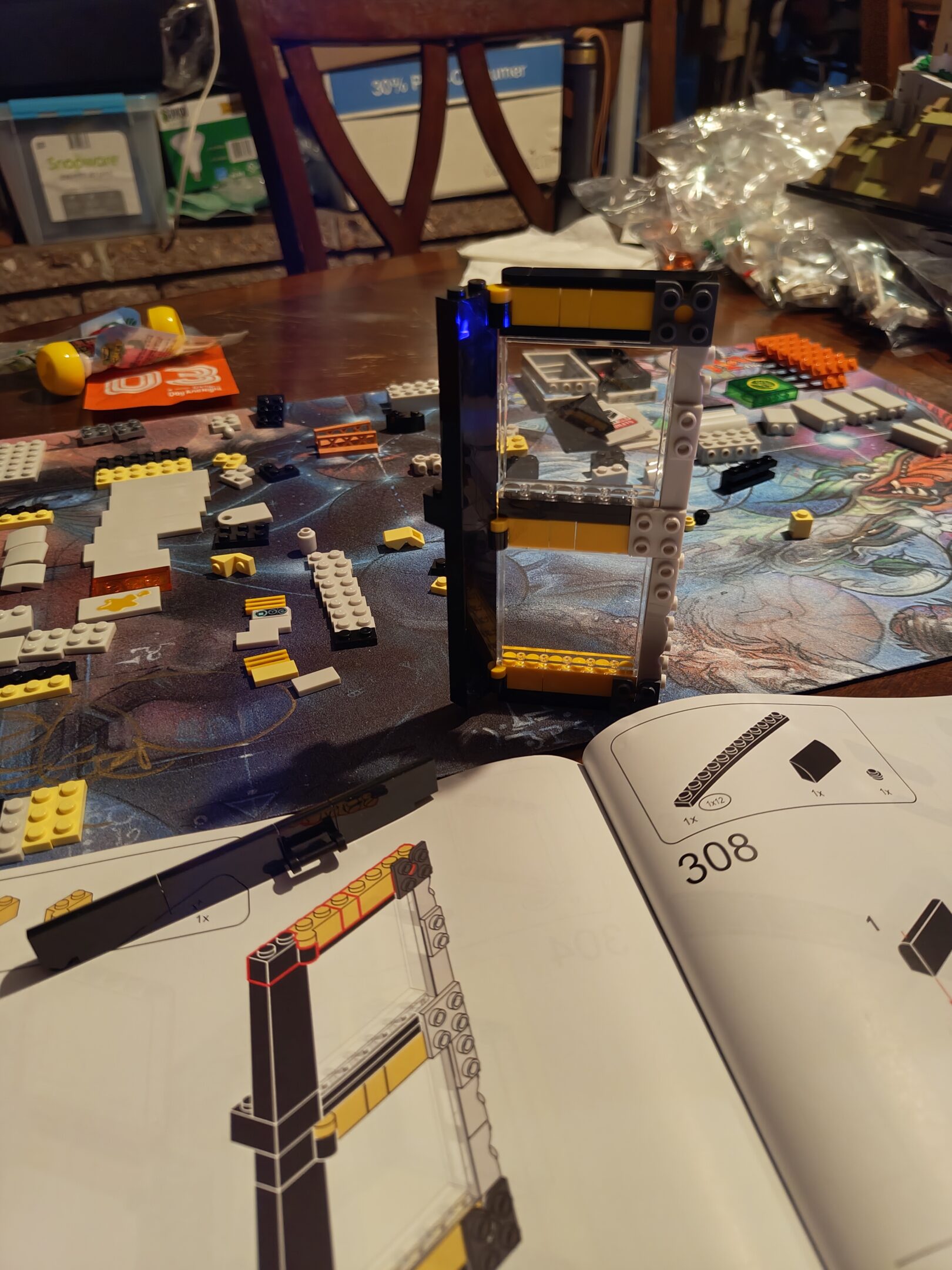 ah, went ahead and did a couple more bags/steps next one is step 11 and the first step of the 3rd (and final) book… really coming together. finally put the big neon sign together and i’m still not sure how it animates. maybe there’s a power controller or something further in the set to make them alternate?