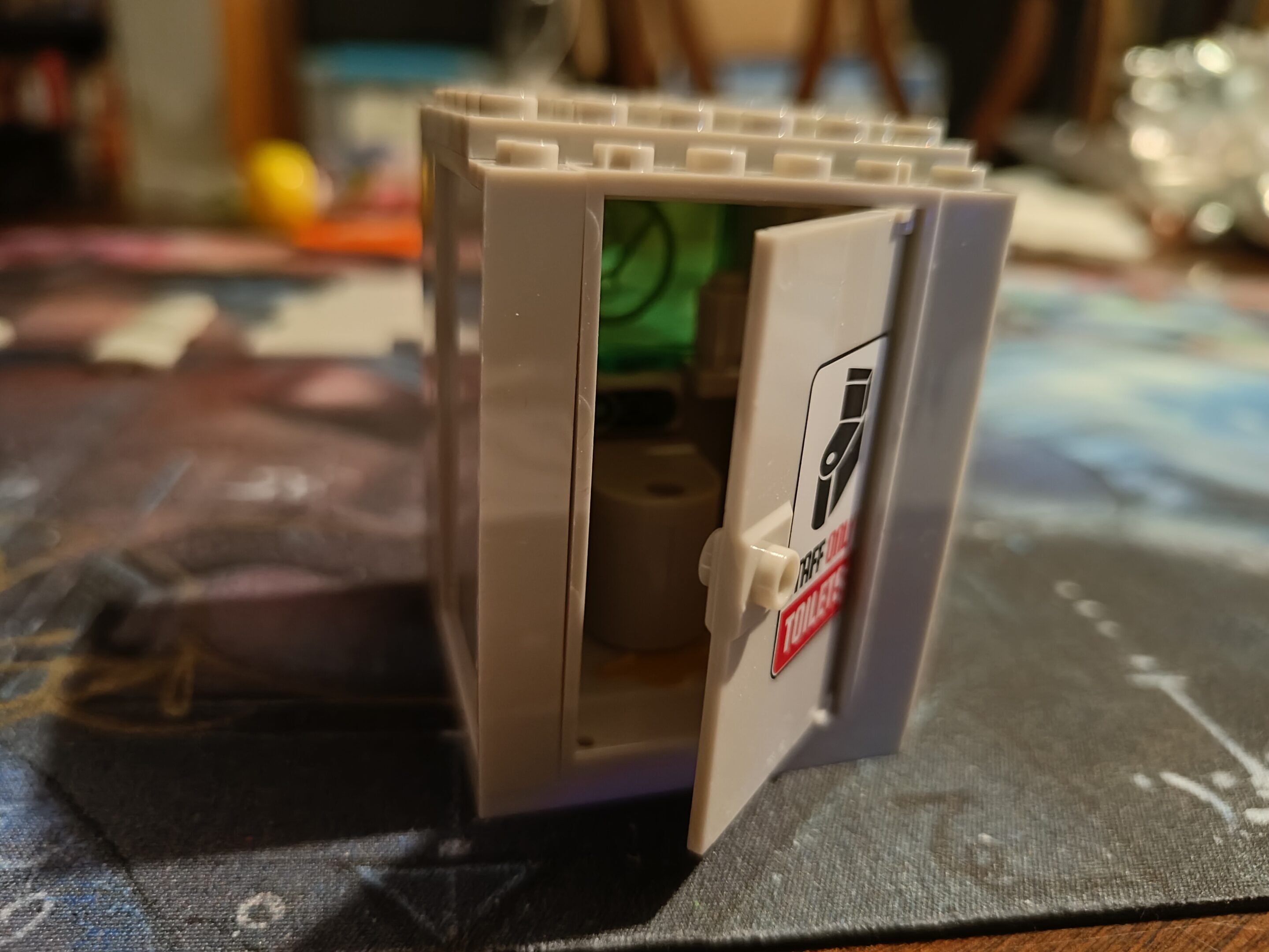 Think this should be the thing in front of the train…Probably because it wasLittle side railAnother swing-out wall structureI think the hinge pieces might be among my favoritesFor some reason, thought this was supposed to animate. Not sure how yet?Some wall, some wiring. And a staircase for good measureCleaned up wall, cleaned up wiring.Someone should have cleaned here, too…Bad staff, leaving a mess in the toilet.Just kinda slid into this hole here with a knob on the back to push/pull it into place