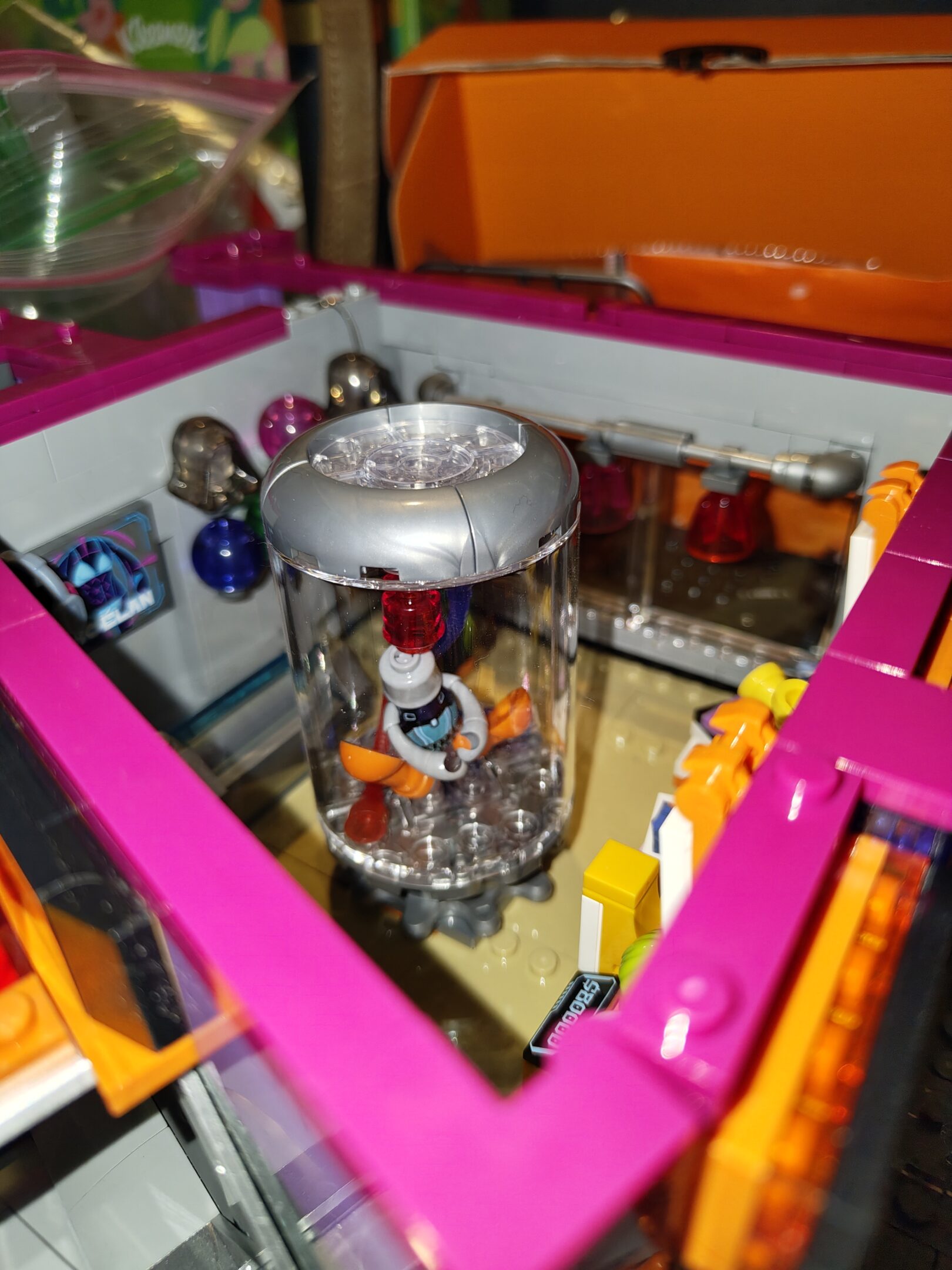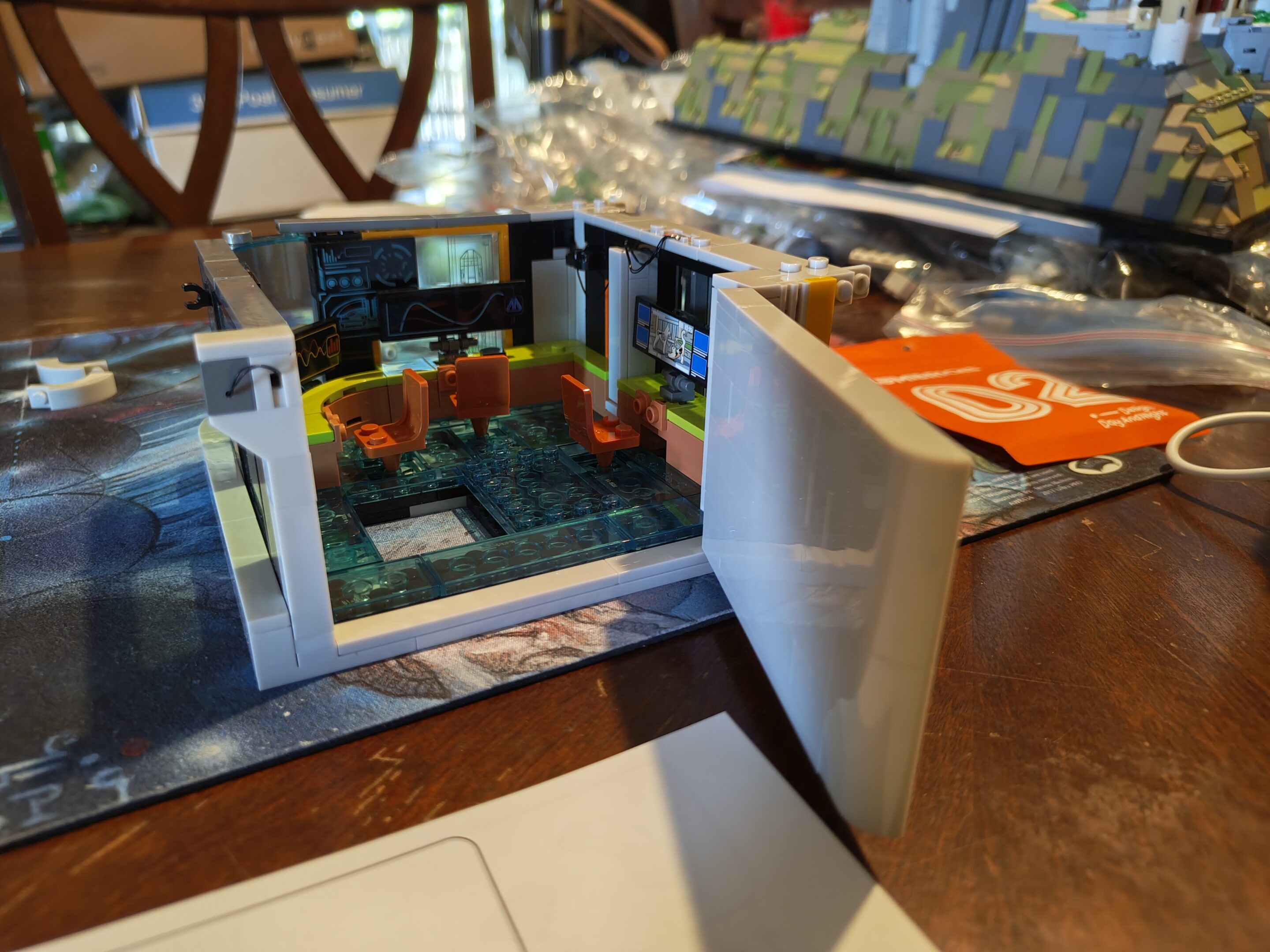 FloorBut also ceiling and useful bits. The thing on the lower left with the wires coming out of it is the pogo pin power connector (so it’s kind of plug and play)Side wall and maybe like an AC unit or somethingOffice coffee pot and model rocket, standard office decorBooksBooks on a bookshelf (and desk, computers, lamp)Outside lightingWindows are inLights work!Pies cooling outside on a windowsill? I will stealThis looks neat but is on an exterior wall…Oh, the wall swings out. Convenient.Stairway to the observatoryI will steal.Outside lighting checkInside lighting check. There’s a sweet little planet display that rotates and the moon rotates around the planet as it goes around the Sun. If this was motorized, I’d lose my mind