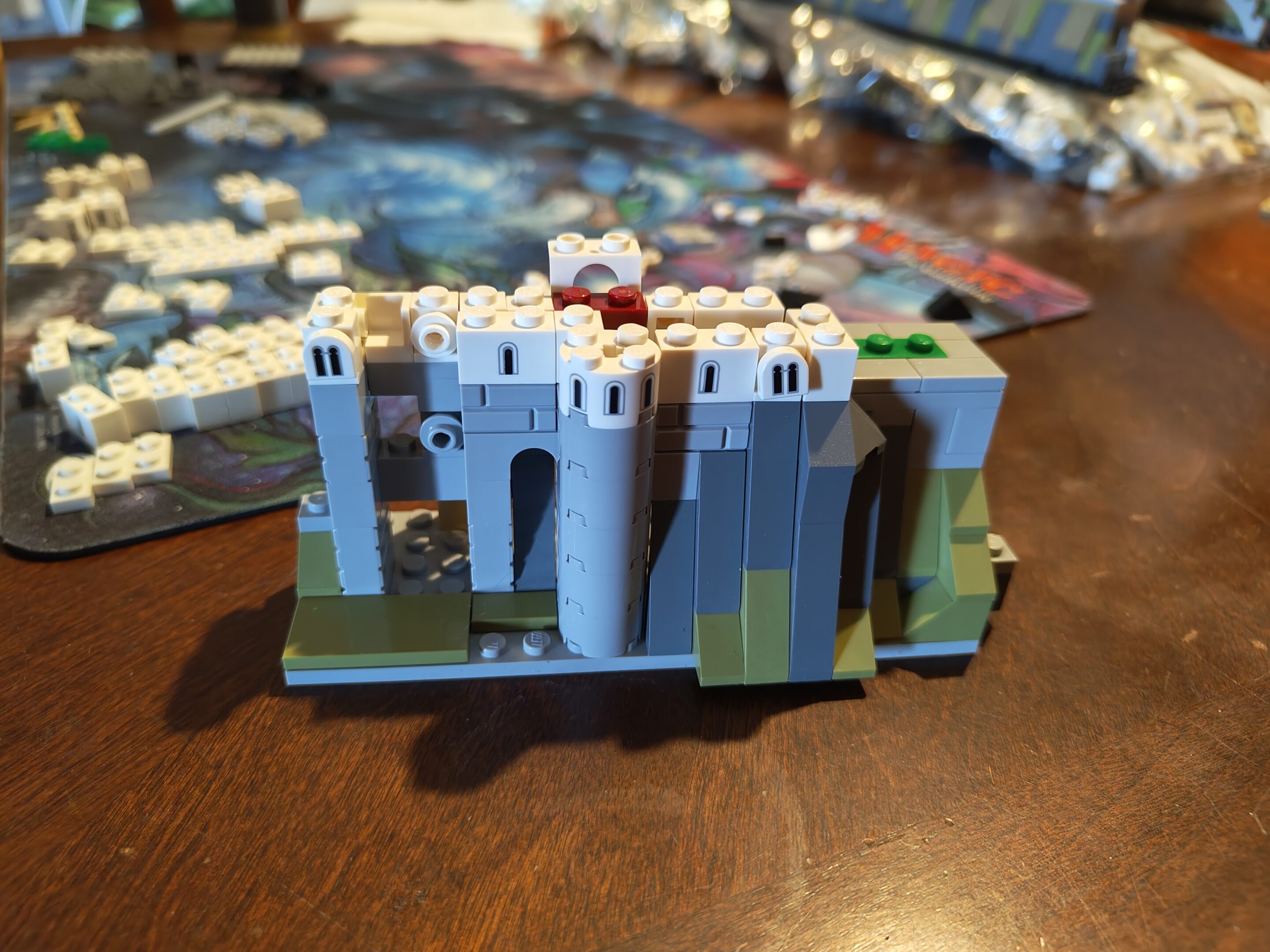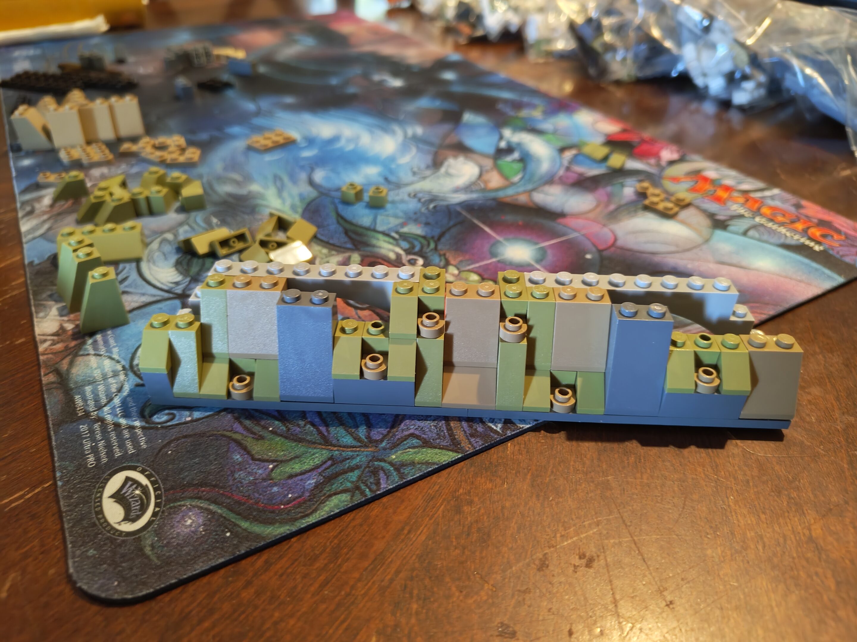 The missing culprit (a 2x1x2 “roof tile” in pale green)We continued building what we couldBeginning of the curved wallFinally getting to some actual castle bitsSweet rampart