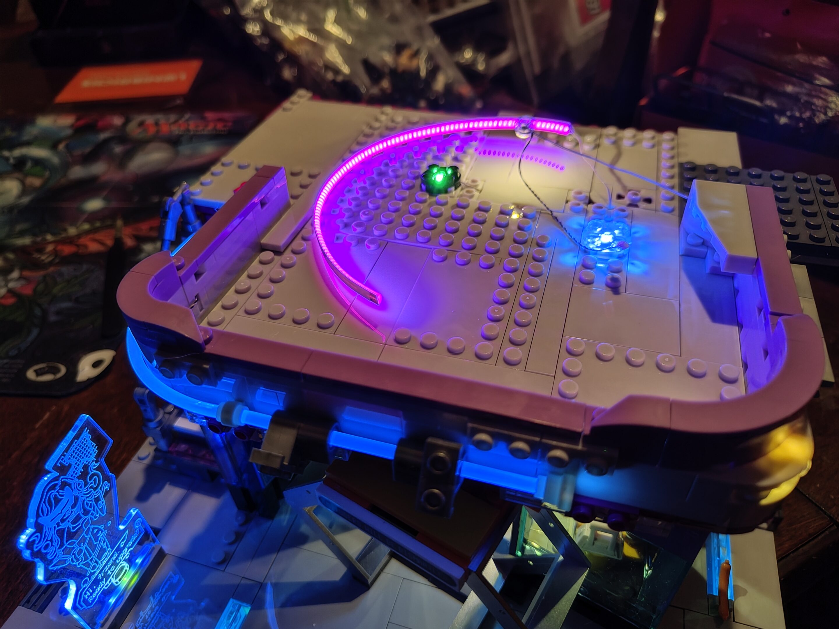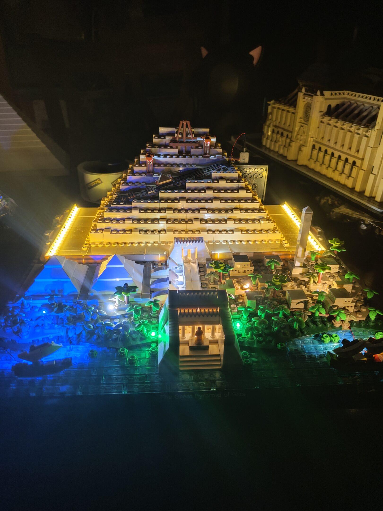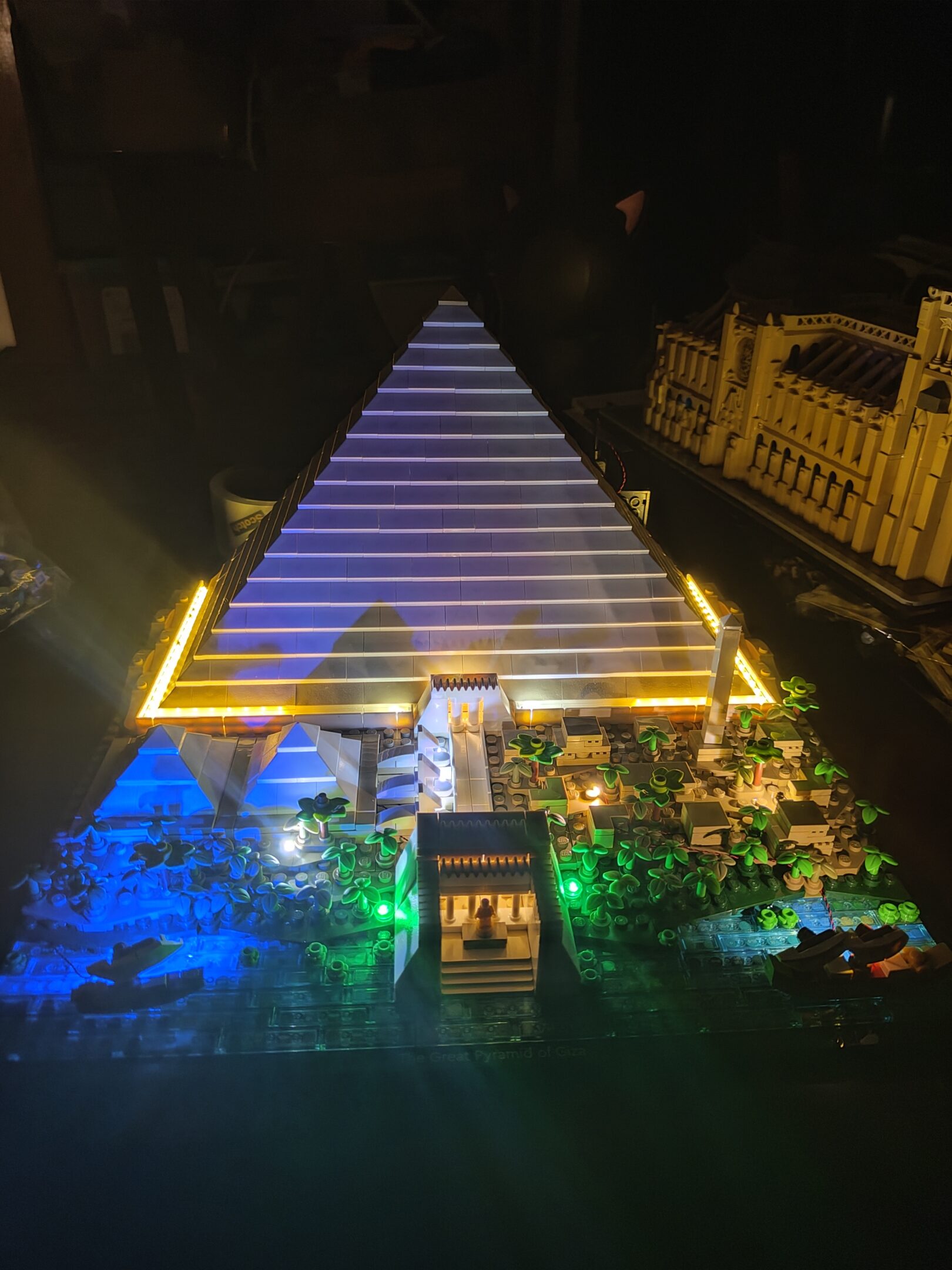 finally got around to doing some of the light kits i picked up, well one of them anyway. i made a mistake and picked giza to go first this was probably one of the hardest things i’ve done with lights and bricks because none of the lights are integrated into bricks, it was all just leds on wires (and two light strips that were together side-by-side but perforated to separate) and a couple hubs, think 25 connections in total. wild. but anyway it looks cool and now to try and figure out how to get power to it inside the cabinet