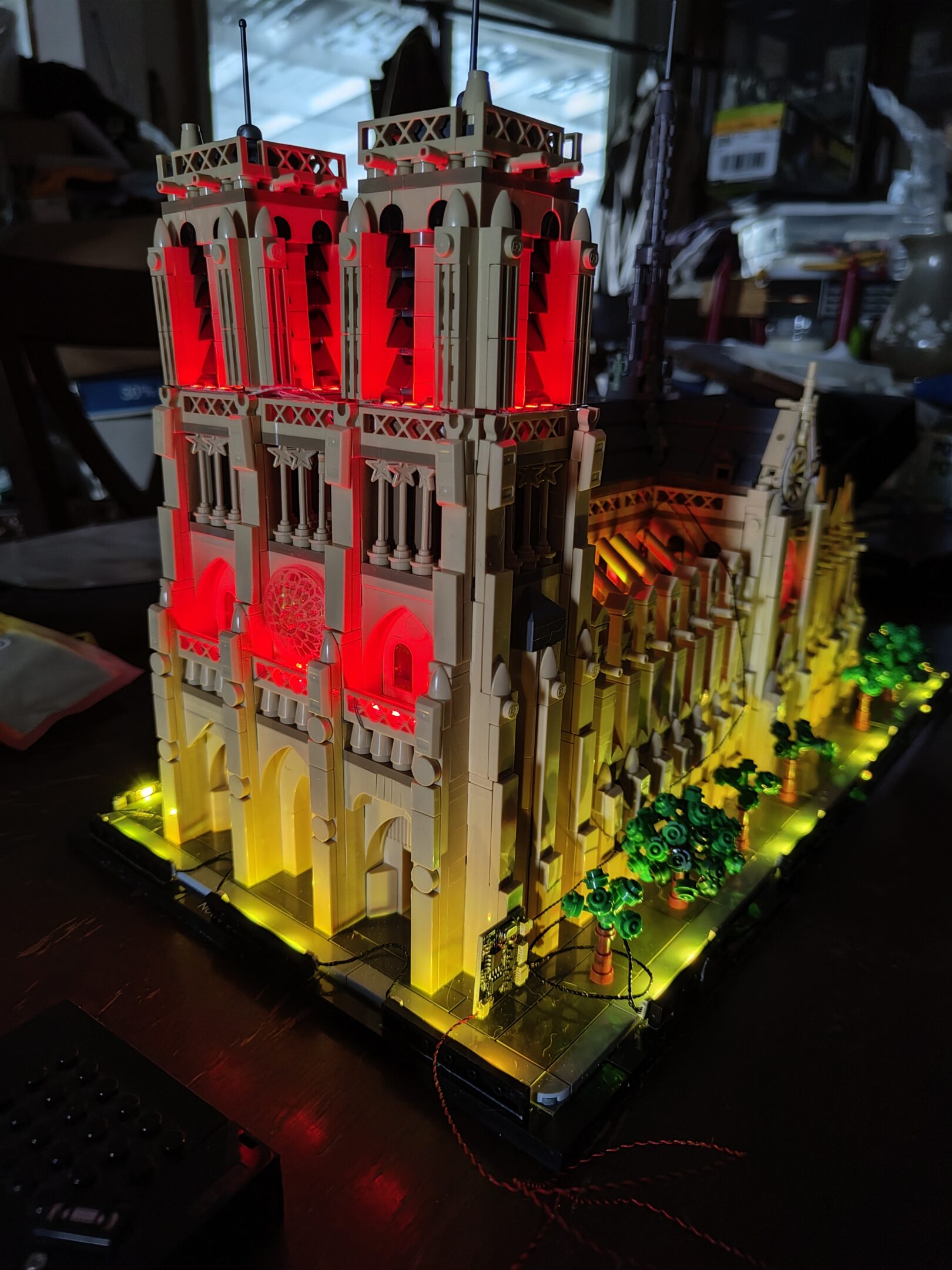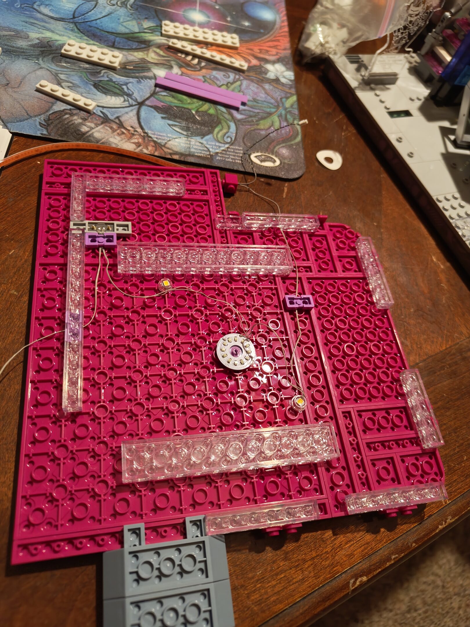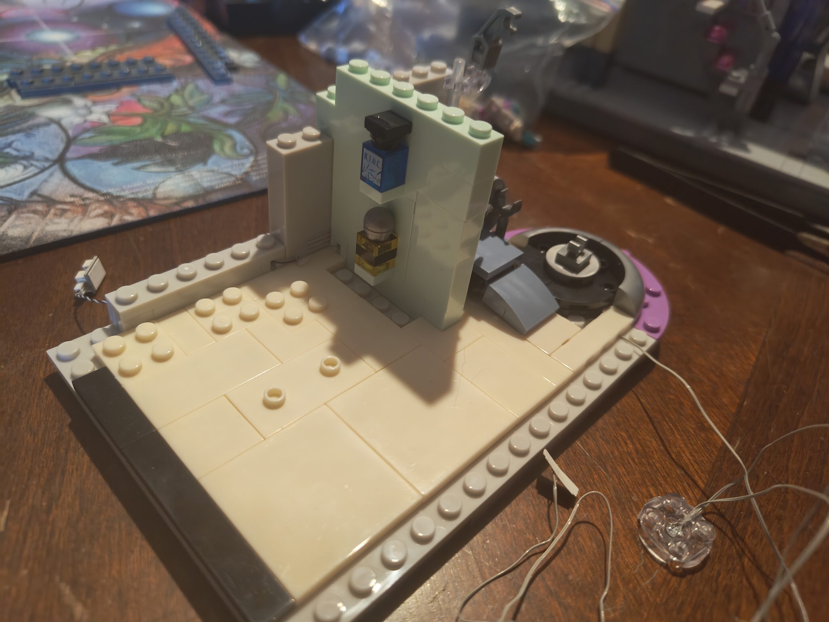 finally got around to doing some of the light kits i picked up, well one of them anyway. i made a mistake and picked giza to go first this was probably one of the hardest things i’ve done with lights and bricks because none of the lights are integrated into bricks, it was all just leds on wires (and two light strips that were together side-by-side but perforated to separate) and a couple hubs, think 25 connections in total. wild. but anyway it looks cool and now to try and figure out how to get power to it inside the cabinet