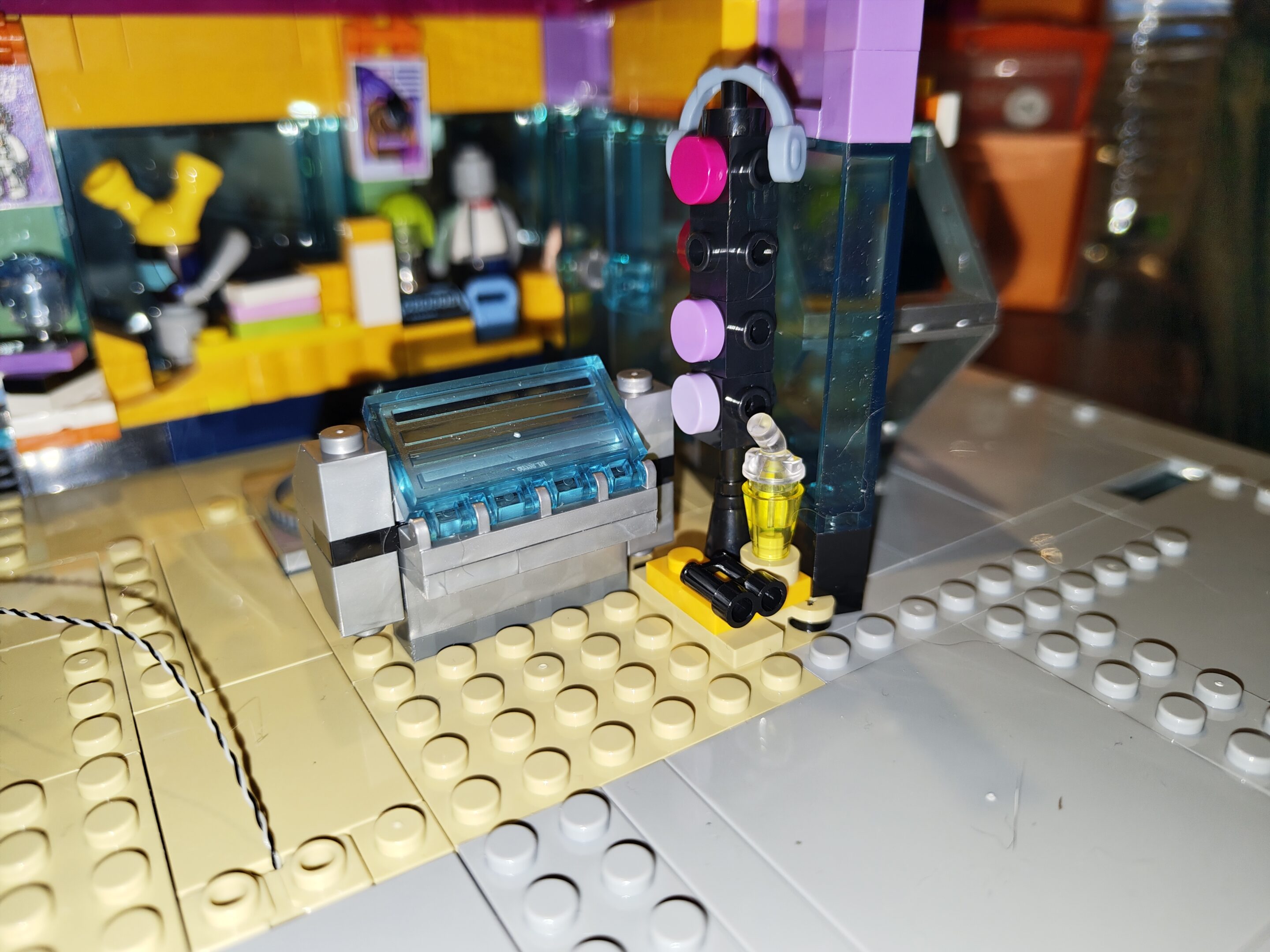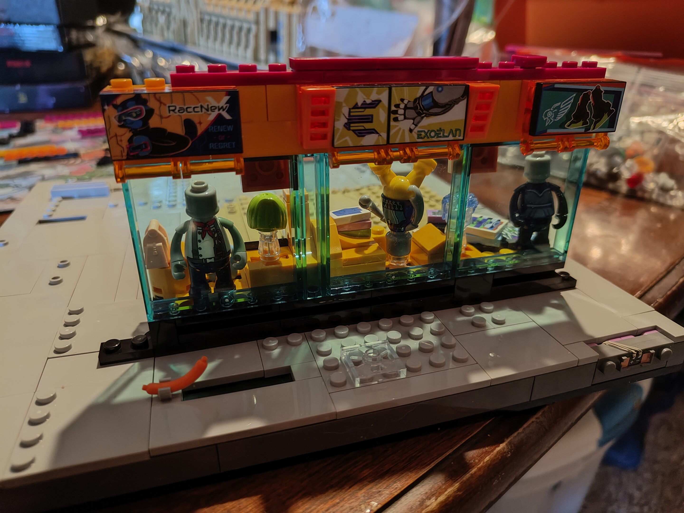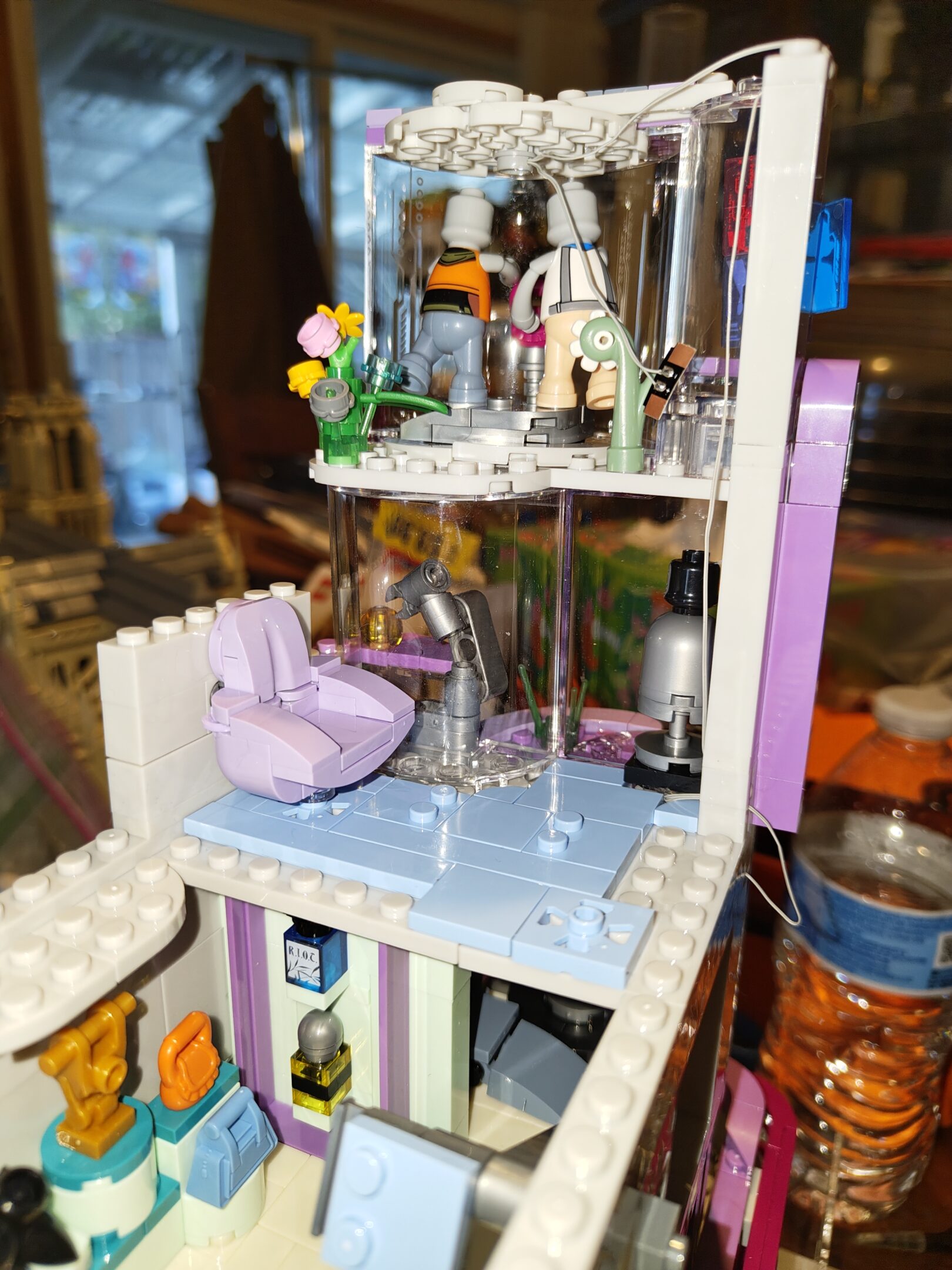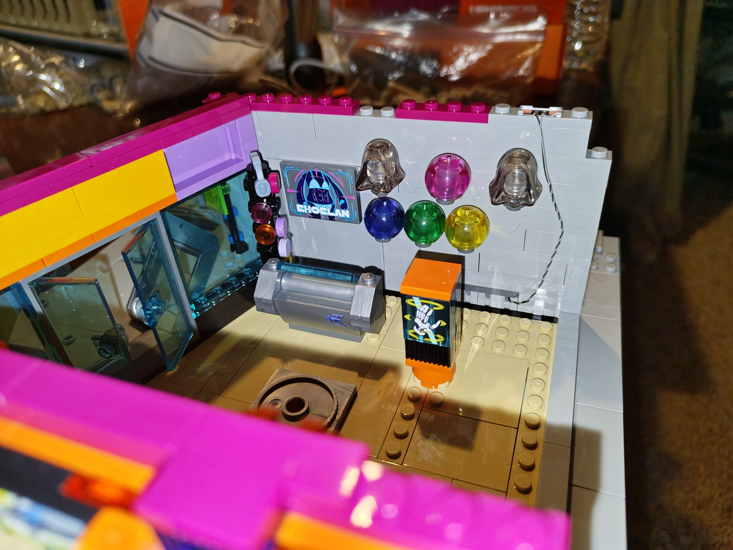 mannequins in a windowdon’t intrude, i guessawning bannerslemon water dispenser, for the builderbaubles on a wallmore signsthe back wall/window swings outand this little dude spins aroundthe second floorthe second floor’s wiring (and lighting for 1st floor)it’s lit, fammore lights, just kinda hanging outthe awning decorations around the 2nd floor. and ‘neon’forgot to get more pictures of this stepbioscanner chair and tools. robot doc on the clamper not picturedneon effect tubing, lights, a lit tree. these sets are so cool