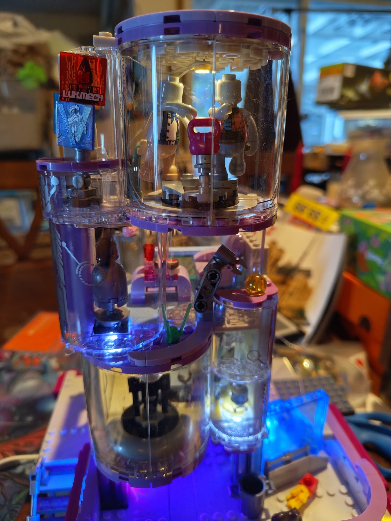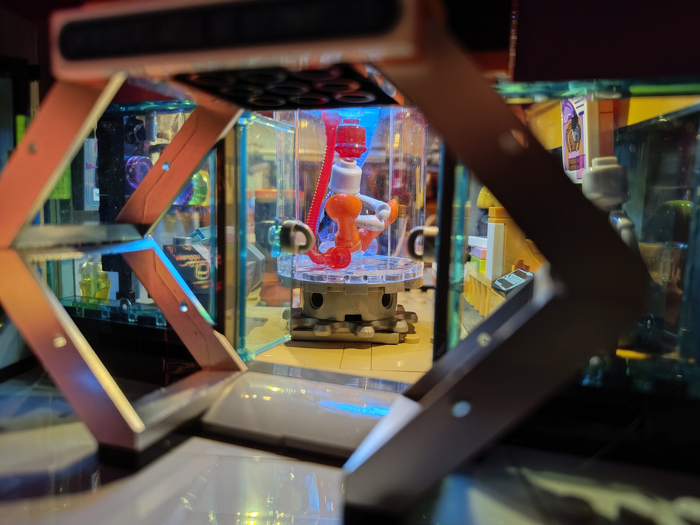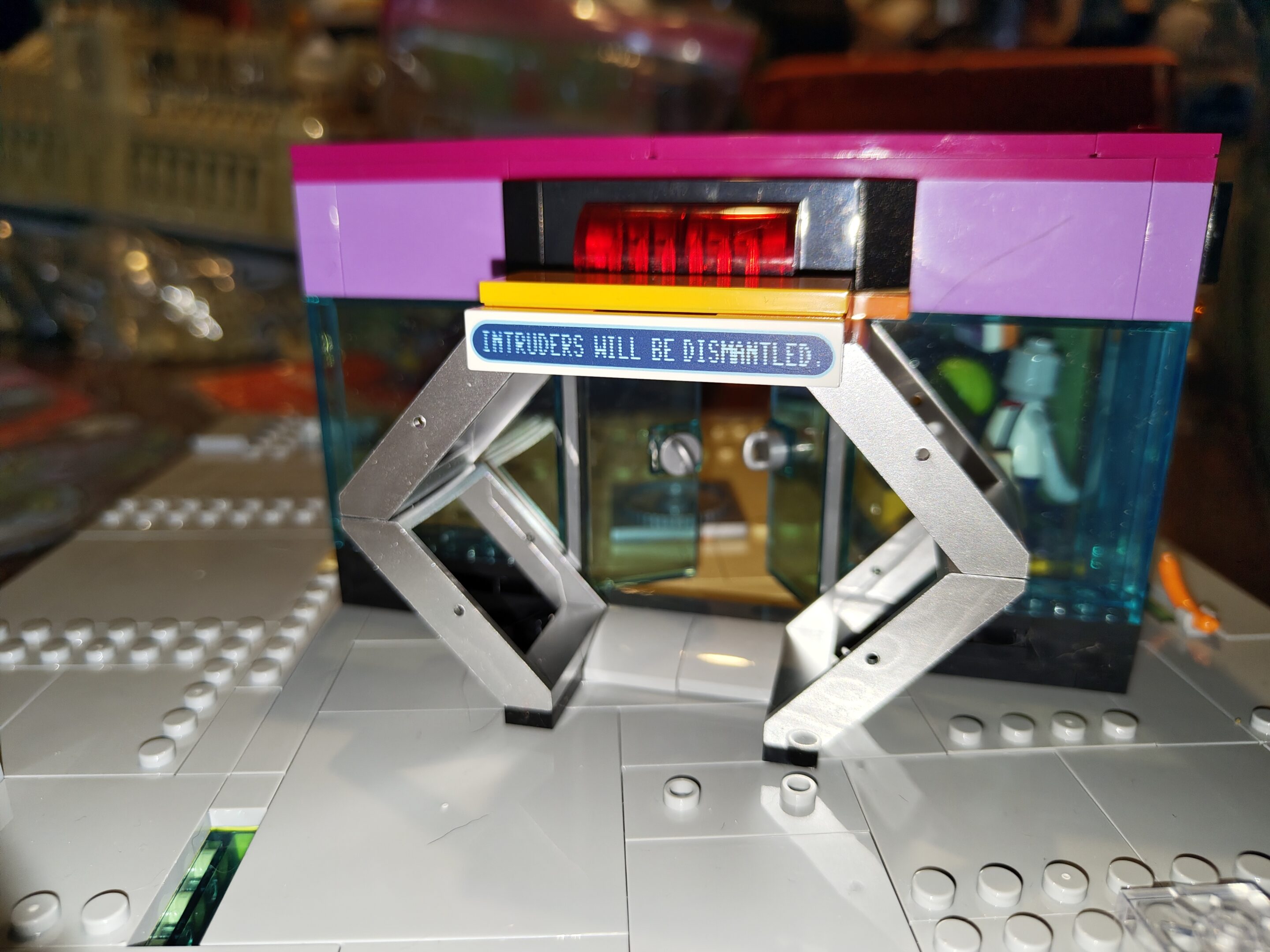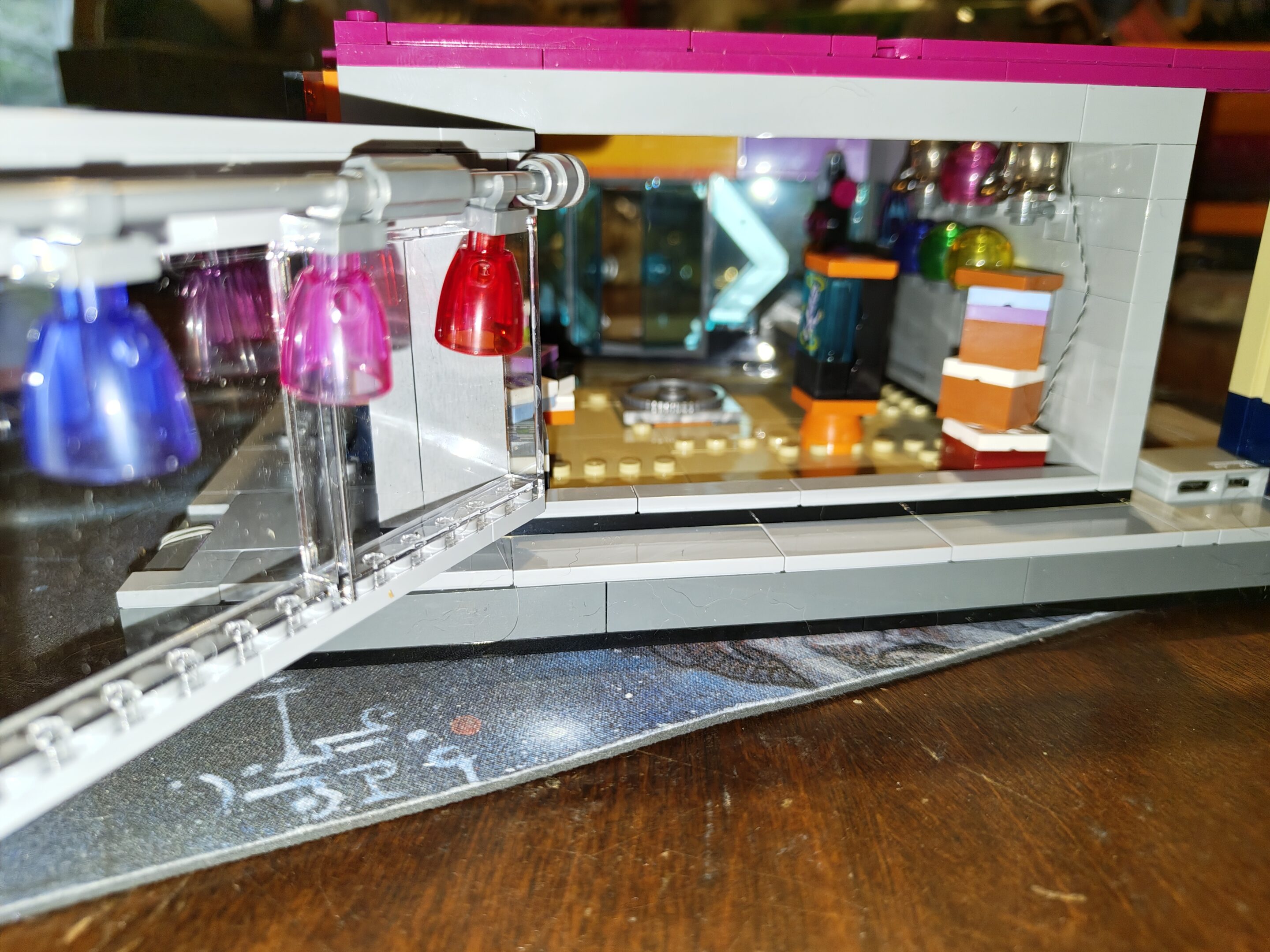 mannequins in a windowdon’t intrude, i guessawning bannerslemon water dispenser, for the builderbaubles on a wallmore signsthe back wall/window swings outand this little dude spins aroundthe second floorthe second floor’s wiring (and lighting for 1st floor)it’s lit, fammore lights, just kinda hanging outthe awning decorations around the 2nd floor. and ‘neon’forgot to get more pictures of this stepbioscanner chair and tools. robot doc on the clamper not picturedneon effect tubing, lights, a lit tree. these sets are so cool
